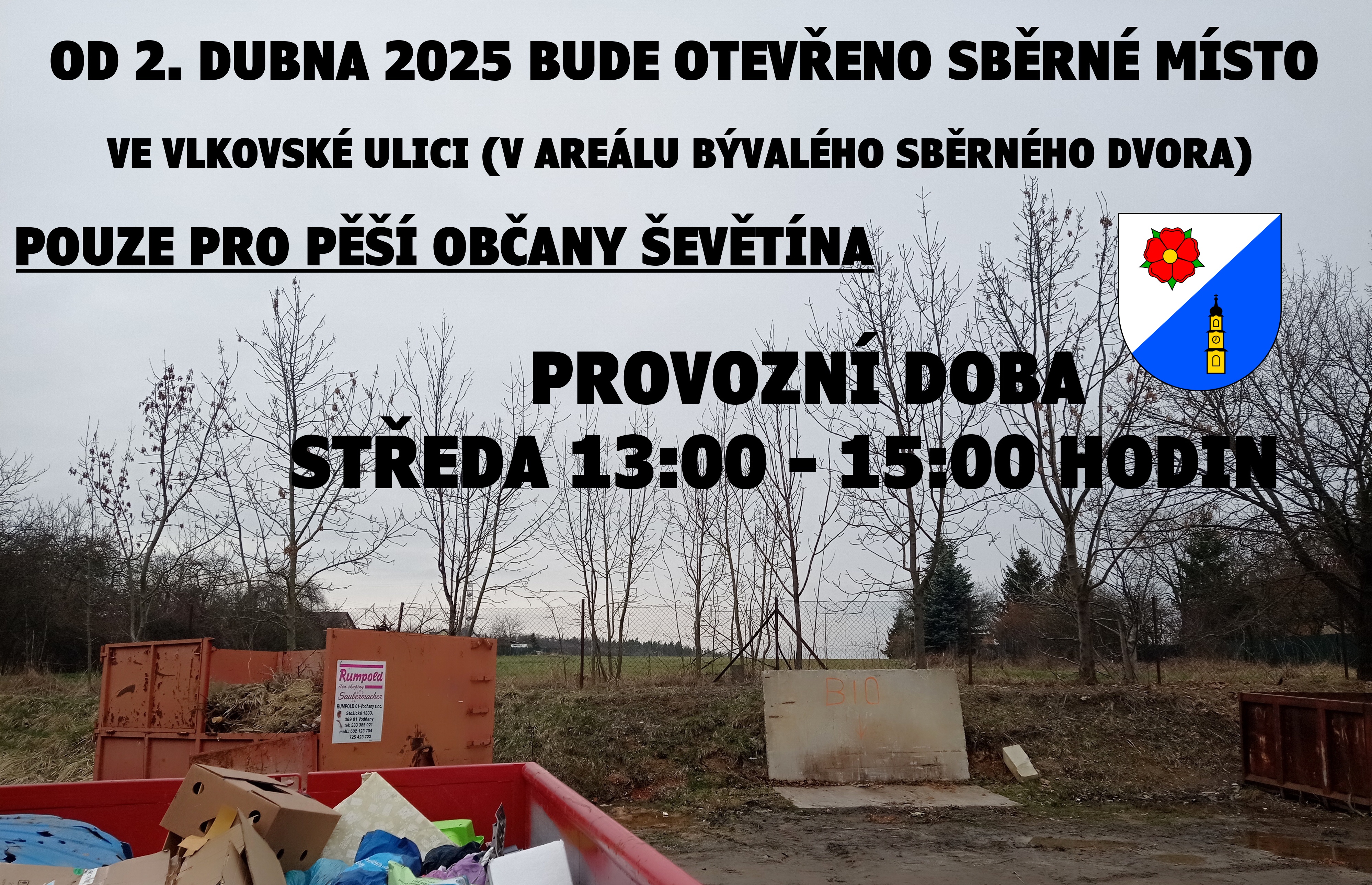 Od středy 4. března 2026 bude opět otevřeno sběrné místo ve Vlkovské ulici (v areálu bývalého sběrného dvora) pro pěší občany Ševětína. Provozní doba: středa 13:00 - 15:00 hodin.