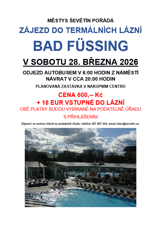 Ve středu 8. dubna 2026 ve 12:55 hodin bude na parkovišti za obecním úřadem v Ševětíně probíhat prodej nosných kuřic z drůbežárny Vadín - Svoboda Lučice. Cena 260,-/kus, barva červená-Isa brown a černá-Morávia. Možné objednat: 569 489 358, svoboda.lucice@seznam.cz.