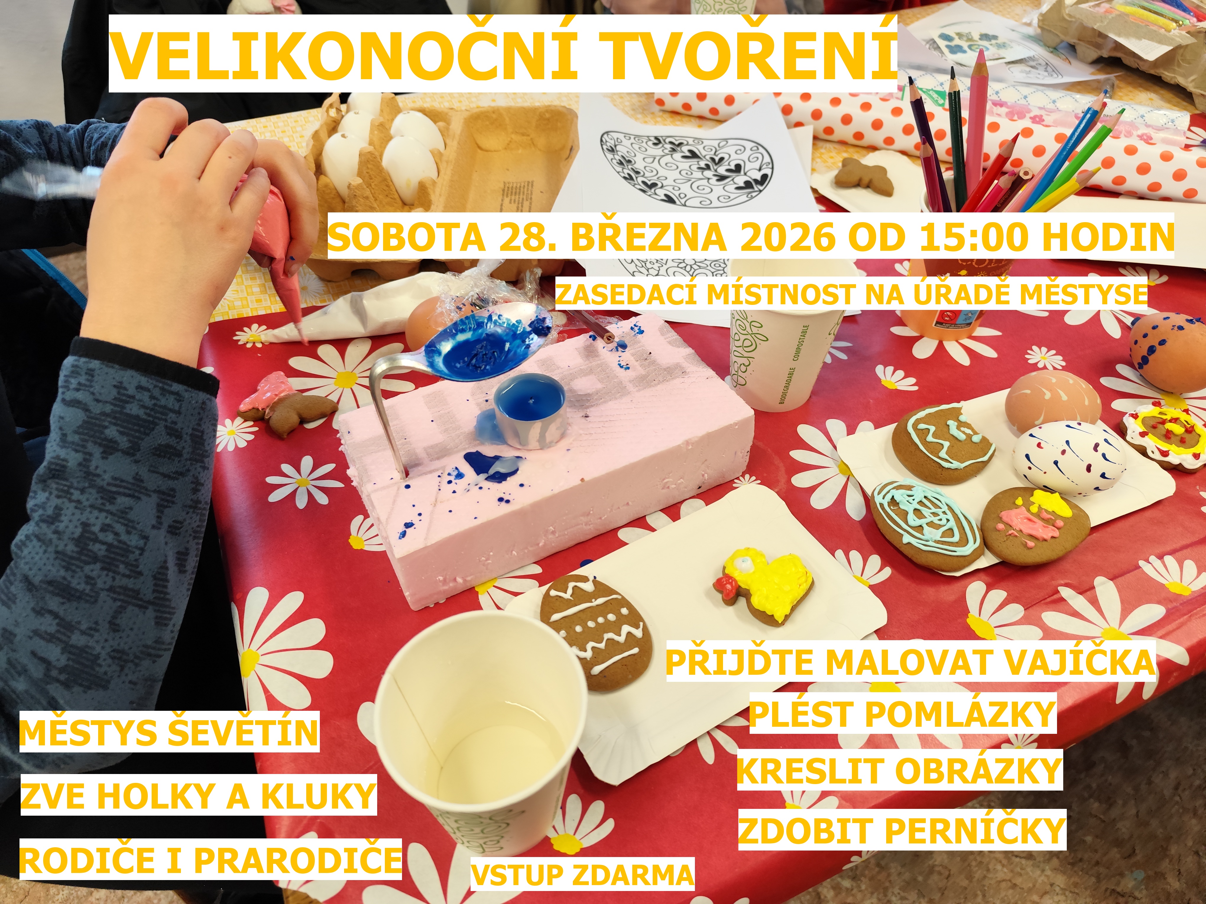 Městys Ševětín srdečně zve holky a kluky, rodiče i prarodiče na tradiční Velikonoční tvoření, v sobotu 28. března 2026 od 15:00 hodin, do zasedací místnosti úřadu městyse. Přijďte malovat vajíčka, plést pomlázky, kreslit obrázky a zdobit perníčky. Vstup zdarma