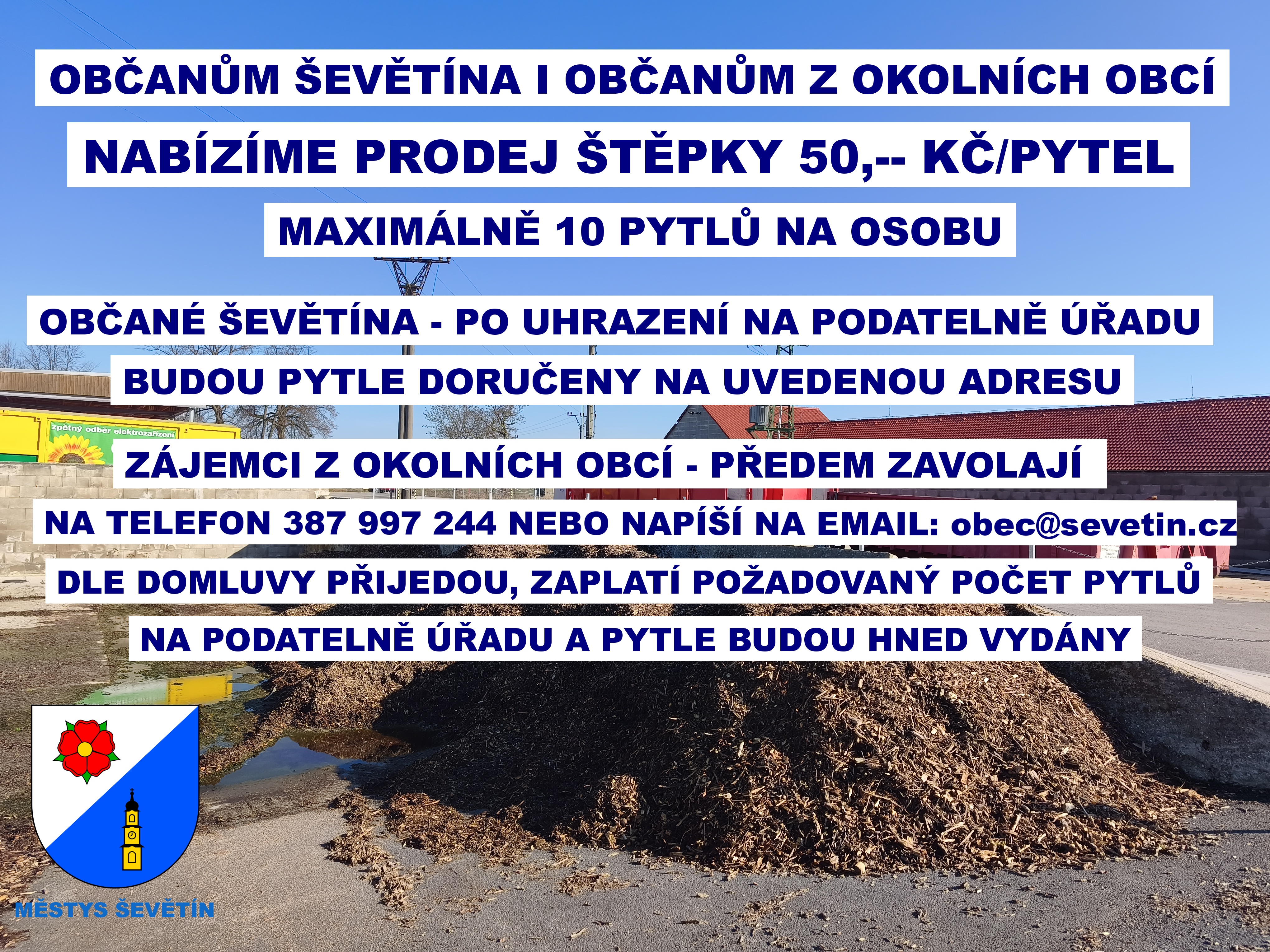 Městys Ševětín nabízí občanům Ševětína i občanům z okolních obcí prodej štěpky 50,-- Kč/pytel. Maximálně 10 pytlů na osobu.