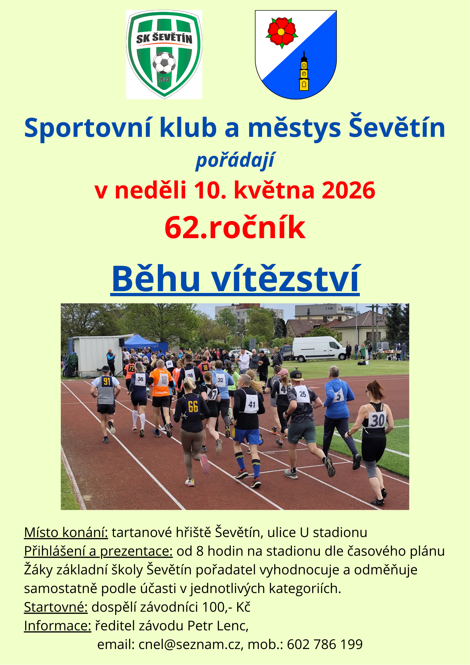 Sportovní klub a Městys ŠEVĚTÍN pořádají v neděli 10. května 2026 62. ročník Běhu vítězství. Místo konání je na tartanovém hřišti, U Stadionu, Ševětín. Přihlášení a prezentace začínají od 8:00 hodin. Startovné pro dospělé závodníky 100,-Kč. Případné další informace získáte u ředitele závodu pana Petra Lence, email: cnel@seznam.cz, mobil: 602 786 199.