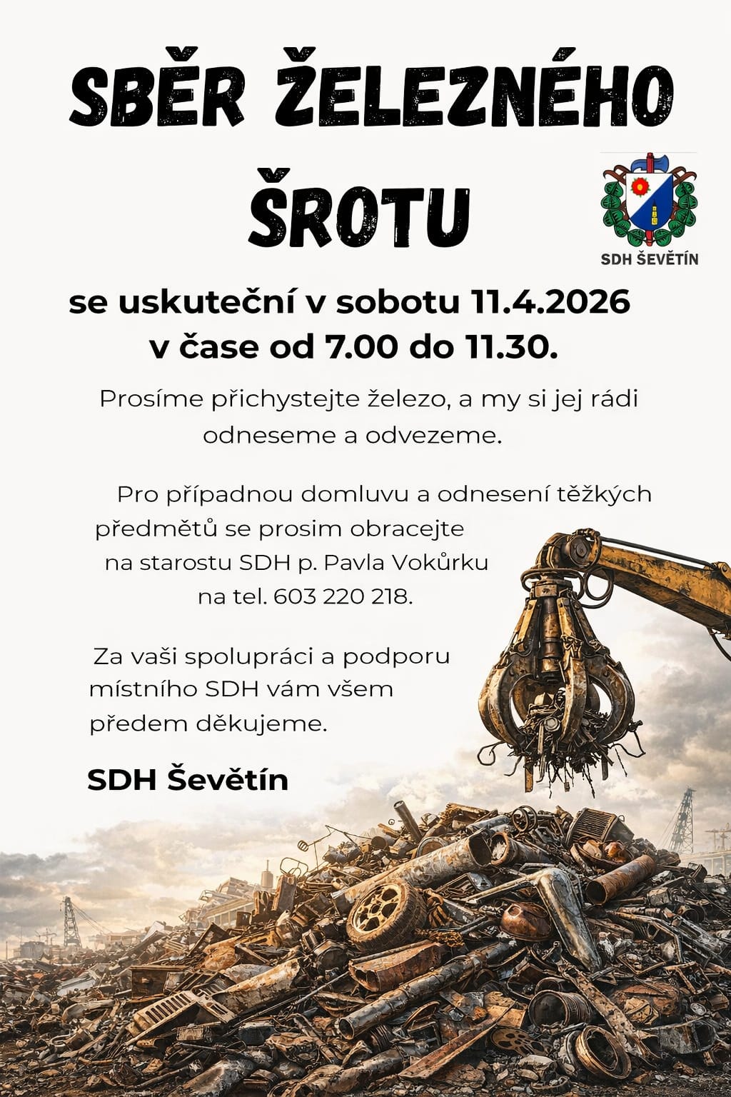 V sobotu 11. dubna 2026 od 7:00 do 11:30 hodin se uskuteční sběr železného šrotu, který pořádá SDH Ševětín. Přichystejte železo, hasiči jej odvezou. Pro odnesení těžkých předmětů, prosím, volejte starostu SDH p. Pavla Vokůrku, tel.: 603 220 218. Děkujeme.