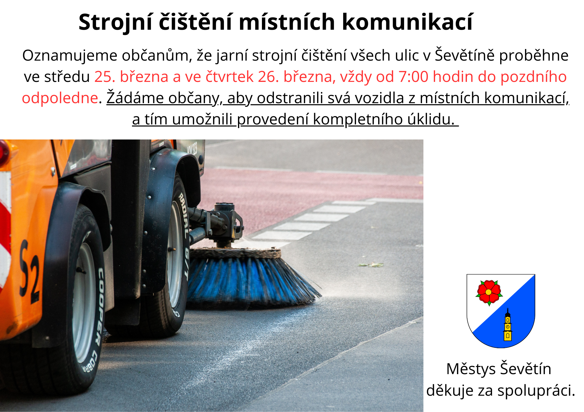 Ve středu 25. března a ve čtvrtek 26. března 2026 bude probíhat od 7:00 hodin do pozdního odpoledne strojní čištění všech místních komunikací, viz příloha.