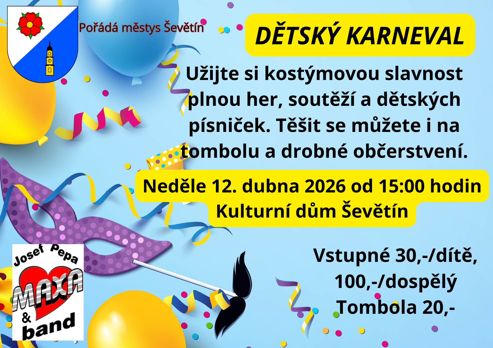 Městys Ševětín Vás zve v neděli 12. 4. 2026 od 15:00 hodin do Kulturního domu v Ševětíně, kde se bude konat "Dětský karneval". Slavnost plnou her, soutěží a dětských písniček, včetně tomboly a drobného občerstvení. Vstupné 30,-Kč/dítě, 100,-Kč/dospělý, tombola 20,-Kč.