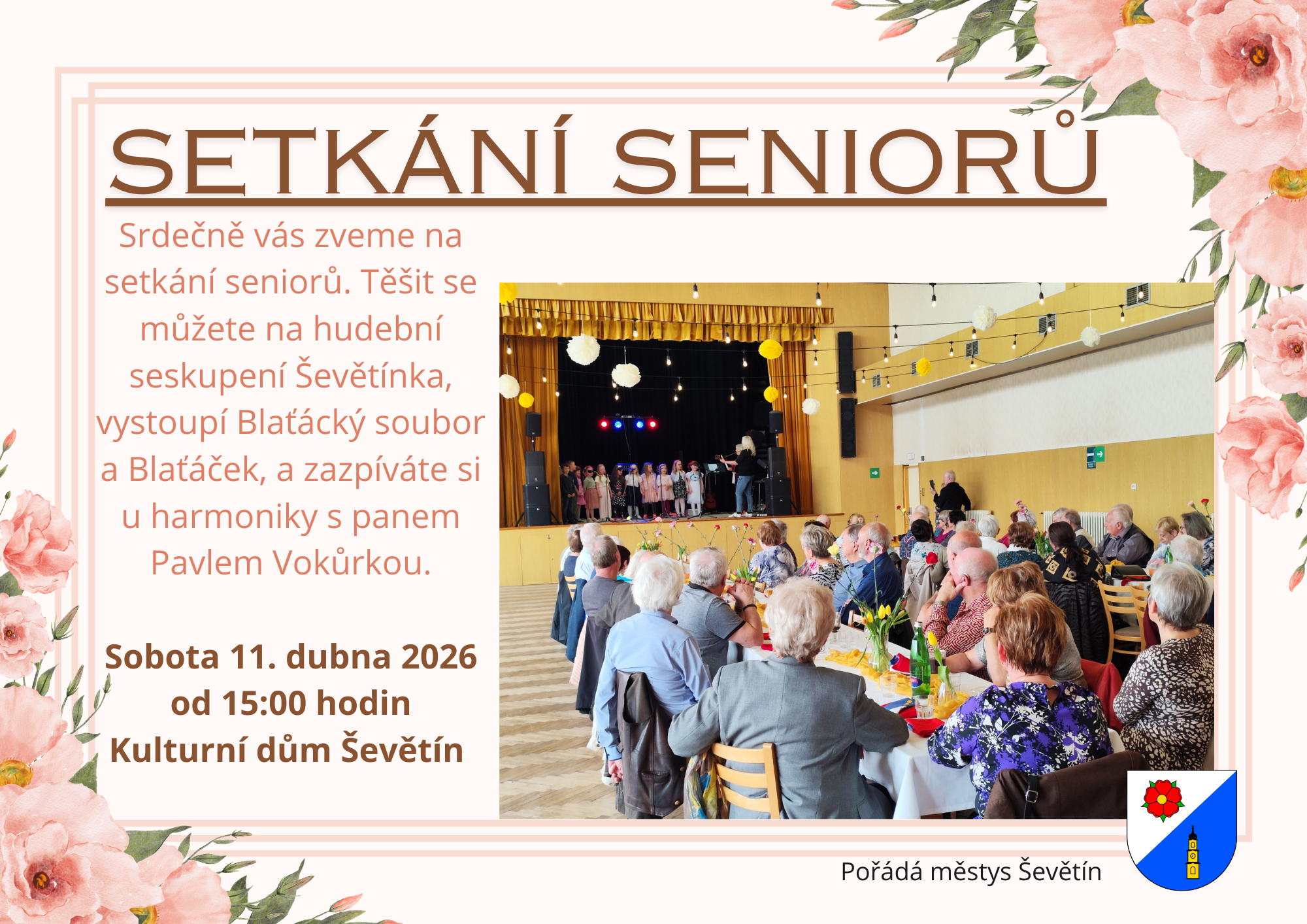 Srdečně vás zveme na setkání seniorů, které se koná v sobotu 11. 4. 2026 od 15:00 hodin v kulturním domě Ševětín. Těšit se můžete na hudební seskupení Ševětínka, vystoupí Blaťácký soubor a Blaťáček, a zazpíváte si u harmoniky s panem Pavlem Vokůrkou.