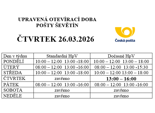 Česká pošta, s.p., oznamuje, že z provozních důvodů dojde ve čtvrtek 26.03.2026 ke změně hodin pro veřejnost v provozovně Ševětín, viz příloha.